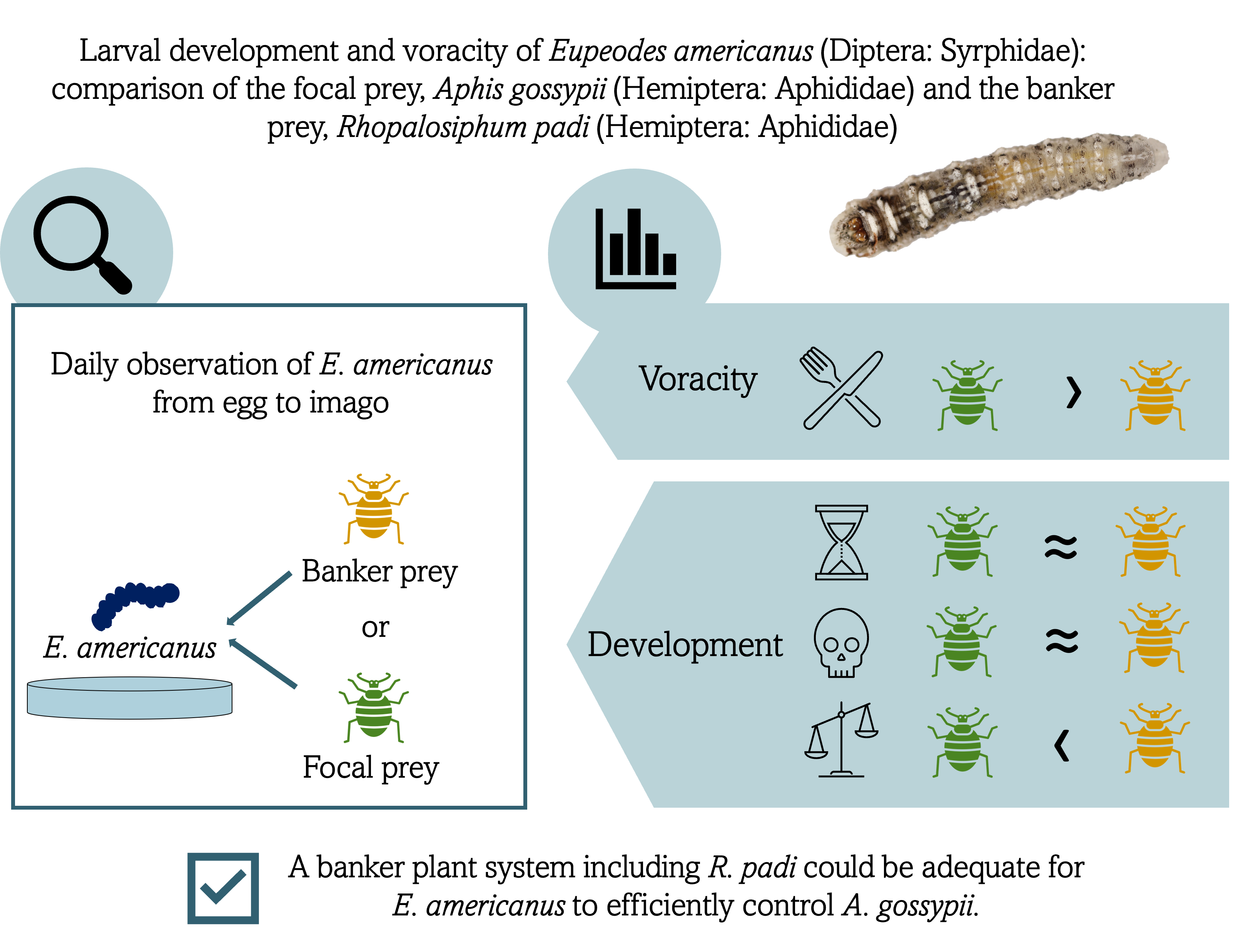 Unlike European species, the potential of Nearctic syrphid species as biological control agents is still poorly studied. Nonetheless, the American Hoverfly (Eupeodes americanus Wiedemann 1830) has recently demonstrated promising results as a biological control agent, notably against the foxglove aphid (Aulacorthum solani Kaltenbach 1843) on pepper. The present study aims to extend our knowledge of the American Hoverfly, and more specifically to evaluate its potential as a biocontrol agent in a banker plant system, against the melon aphid (Aphis gossypii Glover 1877) in greenhouse cucumber crop. In banker plant systems, the success of the biocontrol is clearly linked to the voracity of the predator on the banker prey and the focal prey (pest) and to the respective values of both preys for the development of the predator. Consequently, the preimaginal development and voracity of E. americanus were compared when preying upon the focal prey (melon aphid, A. gossypii) or the banker prey (bird cherry-oat aphid, Rhopalosiphum padi L. 1758) by the daily observation of larvae from egg to adult emergence (25°C, 16 L:8 D photoperiod and 50% R.H). Development of the larvae was similar on both prey species, except for 3rd instar and pupal weight that were higher for larvae fed with the banker prey. The ad libitum voracity was similar on both preys except for the third instar larva which consumed more focal preys. Results suggest that a banker plant system involving the bird cherry-oat aphid could be adequate for E. americanus to efficiently control the melon aphid.