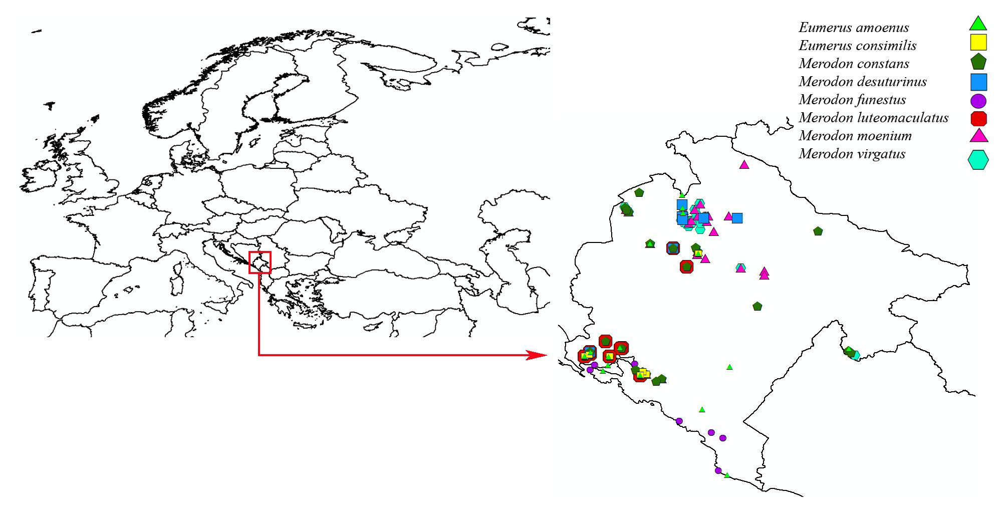 Global climate changes have a significant impact on species abundance and biodiversity. In Montenegro, one of the European biodiversity hotspot areas, more than 380 hoverfly species have been registered (Malidžan pers. comm.). According to few previous studies, climate changes have a negative impact on most of analyzed phytophagous species1,2. In order to investigate climate change's impact on some species from genera Eumerus Meigen, 1822 and Merodon Meigen, 1803 of Montenegro, we analyze their potential past and current distribution, and their potential response to future climate change scenarios. Three climate models (CNRM-CM5, HadGEM2-ES, IPSL-CM5A-LR) were applied for past and five climate models (CNRM-CM5, HadGEM2-ES, IPSL-CM5A-LR, MPI-ESM-LR, NORESM1-M) for future climate prediction. According to our results, most of analyzed species could increased their potential distribution during the past to present timeframe. On the other hand, future predictions lead to decreasing in distribution for most of the studied species, except Eumerus amoenus, which would potentially increase its distribution in the future. As our results indicate that climate change can have a potentially negative effect on the distribution of these species in the future, in order to protect and preserve them, additional conservation measures should be considered.