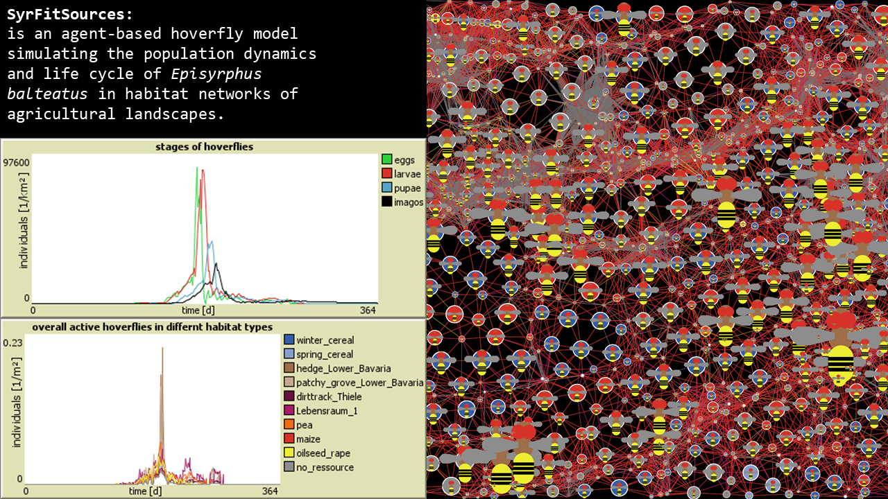 In order to examine the effects of local habitat quality and landscape configuration on population dynamics, we developed an agent-based model (ABM) for the aphidopahgous Episyrphus balteatus. To enable fast computation of syrphid behavior on a daily basis over many years in landscapes covering some square kilometers, we simplify the landscape to resource patches connected in a habitat network. To estimate the amount and phenology of floral resources per habitat, we used realistic lists of flowering plants for each habitat type based on the FloRes database. Further, the model simulates the development of aphid colonies dependent on air temperature, the feeding and progression of different stages of syrphid larvae, and the foraging behaviour and energy balance of imagines. The stage-specific larval mortality is calculated based on the number of aphids they feed daily and throughout the larval stage. For the imagines the mortality rate increases with the days the spend active and through the air temperature the active days were initiated.