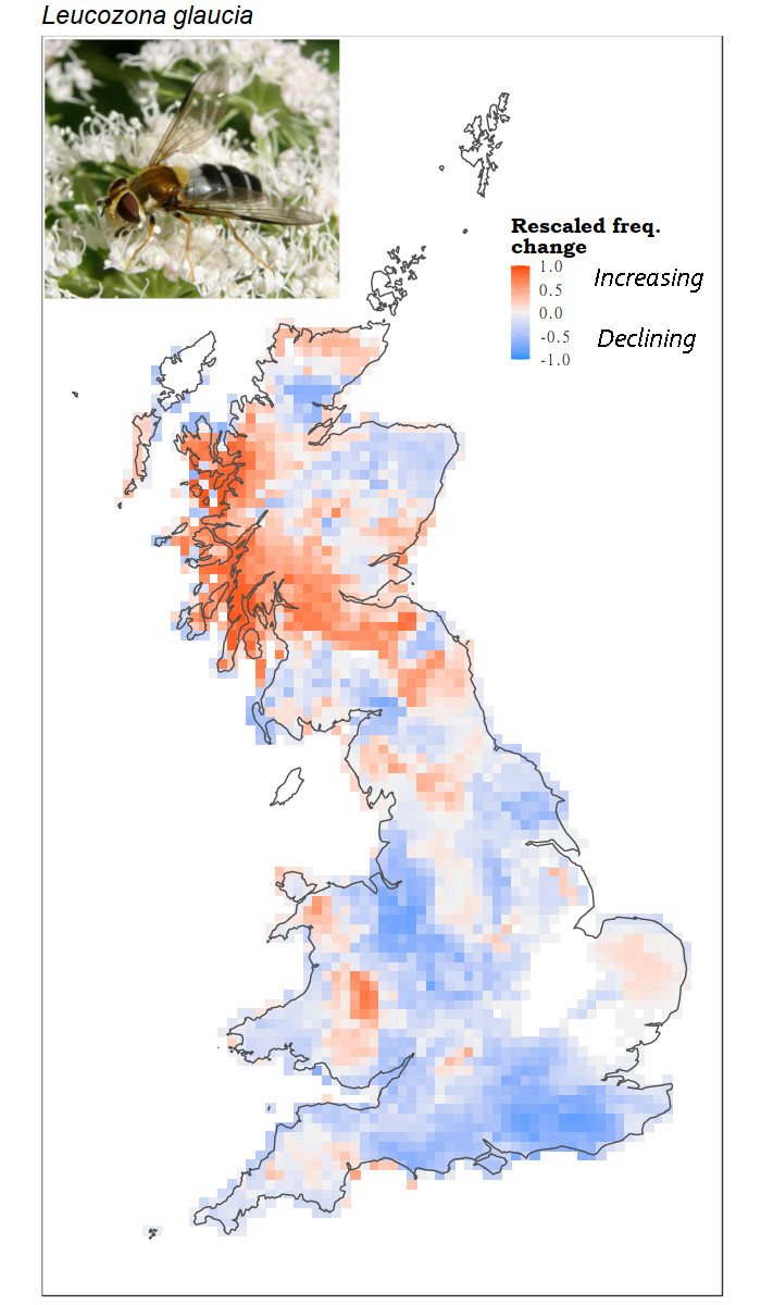 Leucozonia glaucia is an easily identified hoverfly that commonly visits flowers, particularly Apiaceae, in Britain. Consequently, it is relatively well recorded. In recent years there have been noticeably fewer records from south-east England, although that is the most intensively recorded region. This led us to study its distribution and how it has changed over time. Three different methods were used: Mark Hill's FRESCALO, Species Distribution Modelling (mainly Maxent) and General Additive Models. Sufficient data was available for the years between 1980 and 2021, although it was only possible to use the period 1992 to 2018 for some analyses because this is the period for which ESA Landcover was available.